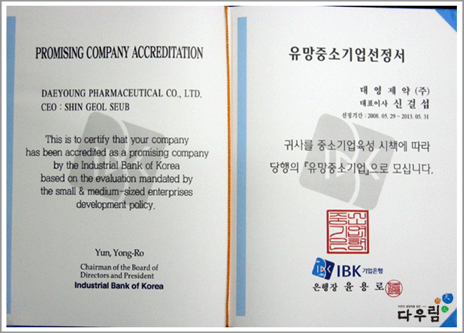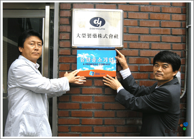 ![]() ![]() ( 대영제약 대표이사(신걸섭), 중소기업은행 상동지점장) ![]() (유망 중소 기업 선정 확인증) |