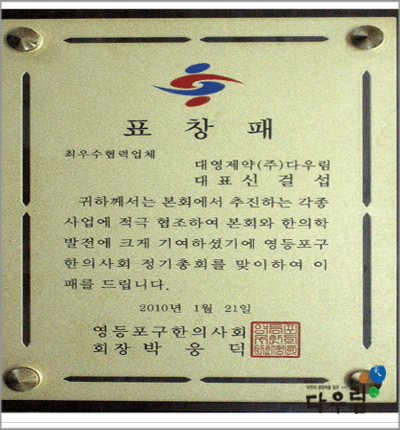 | 영등포구 한의사회 제56회 정기총회 2010년1월21일에 개최되었습니다. 대영제약"다우 림"이 최우수 업체로 선정되어 표창패를 받았으며, 고양시 한의사회 제29회 정기총회(2010 년1월26일)에서 "감사패"를 수여받았습니다. 대영제약은 앞으로 더욱 노력하여 한방산업 발 전에 기여 할 수 있도록 최선을 다하겠습니다. . ![]() 영등포구한의사회 총회 공로패 시상식 ![]() 최우수 업체 시상 및 표창패 ![]() 고양시한의사회 총회 고양시 한의사회 장학금 시상식 감사패시상 및 감사패 |