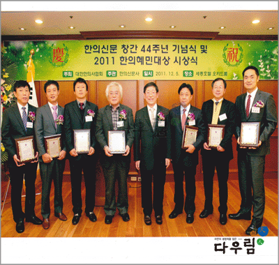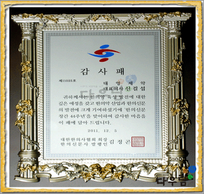 | 한의신문 창간44주년을 맞아 지난12월05일 대한 한의사협회 주체 한의신문 주관 으로 세종호텔에서 한의혜민대상 시상식및 공로패 감사패 시상식이 거행되었으 며 저희 대영제약(주)다우림이 감사패를 수여하게 되었습니다. 이번 시상식의 계기로 더욱 한의약 발전 육성에 정진 하겠습니다. ![]() ![]() 대 영 제 약(주) ![]() |