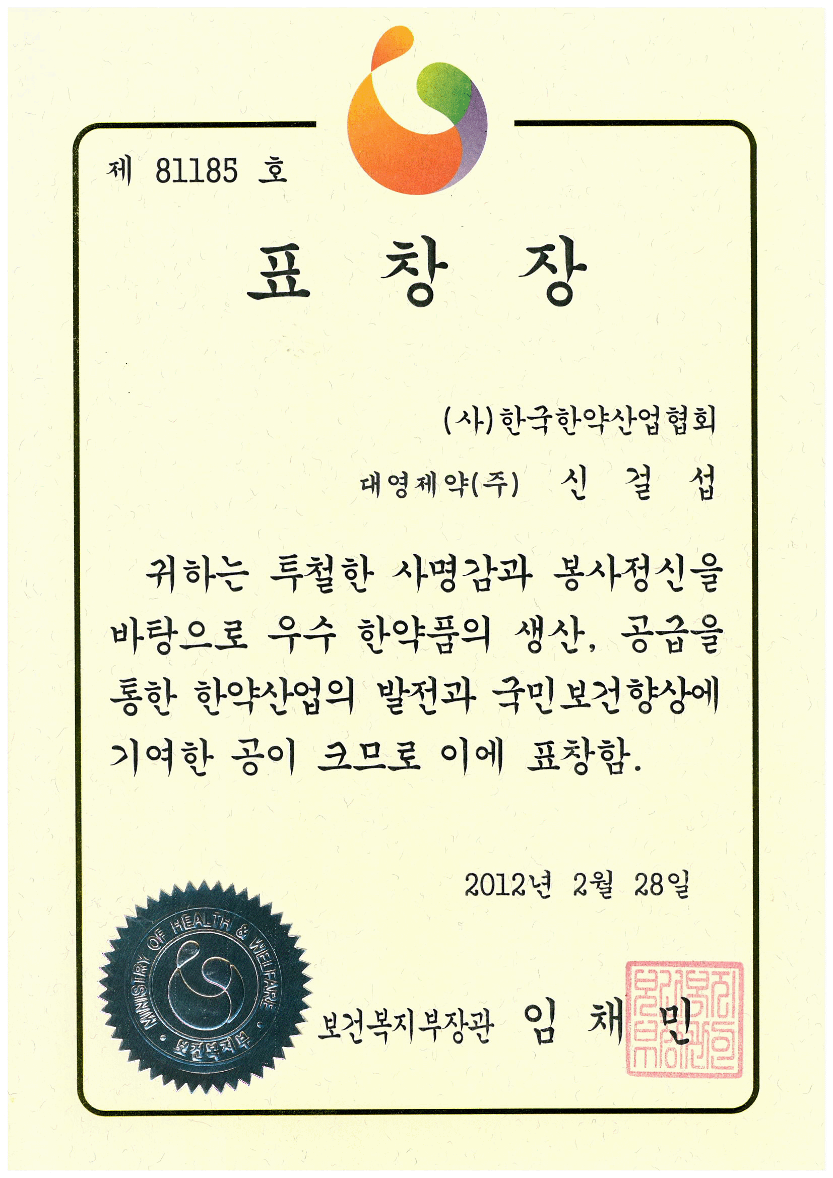 제 11차 한국한약산업협회 정기총회가 1012년 2월 28일 개최되었습니다. 이번 정기총회에 서는 그동안 한의학산업에 공로가 큰 업체를 선정하여 감사패 및 공로패를 수상 하였으며 저희 대영제약(주) 다우림이 보건복지부 장관상을 수상 받았습니다. 이번 표창장이 끝이 아닌 시작이라는 생각으로 앞으로 한약재의 완벽한 품질 관리와 유통질 서를 체계적으로 안착시켜 한방의료기관들이 편안한 진료환경에서 국민의 건강 증진만을 위 해 매진할 수 있도록 더욱 노력하겠습니다. ![]() 대 영 제 약(주)