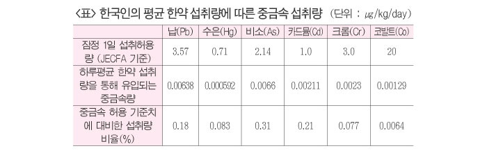 이선동 교수, 서울대 보건대학원과 공동연구 결과 한국인이 많이 먹는 34종의 한약재를 통해 인체로 유입되는 유해한 중금속이 많아야 세계보건기구가 설정한 허용섭취량의 0.3%에 불과하다는 연구결과가 나왔다. 상지대 한의대 이선동 교수(한의약안전성연구회장)는 지난 12월부터 서울대 보건대학원 환경보건학과와 공동 연구한 결과 이같이 나타났다고 밝혔다. 이선동 교수는 “한약의 안전성이 사회적 문제로 떠오르는 가운데 과연 한약의 위해성 정도가 어떠한지 파악하기 위해 기존에 분석된 자료를 활용하여 그 정도를 추정해 보았다”면서 “인체의 중금속 오염은 95% 정도가 식품으로부터 발생한다. 이번 연구는 평균적으로 한국인들이 한약복용으로 인한 중금속 섭취량이 전체량과 비교해 어느정도인지 추정한 것이다”고 말했다. ‘한약재 복용으로 인한 금속 섭취량 추정 및 위해성 평가연구’는 JECFA(FAO/WHO 합동식품첨가물전문가위원회)가 식품에 적용하는 툴을 활용해 1인당 한약재 섭취량과 이에 따른 중금속 섭취량을 분석했다. 연구에 따르면, 다소비 한약재는 국내생산량과 수입량 및 한의원 평균 판매량 자료를 참고하여 결명자, 길경, 사삼, 오미자 등 34종의 한약재를 대상으로 했다. 중금속은 JECFA에서 섭취허용량을 정하여 주의를 주고 있는 납·수은·비소·카드뮴·코발트·크롬 등 6가지로 정하고, 한약재 34종에 대해 보고된 중금속 오염도 자료를 참고하여 체내 유입되는 중금속 양을 추정했다. 그리고 국내 한약 섭취 방식에서 탕제가 79%로 높은 수치여서 이를 감안하여 체내 섭취량을 조정했다. 주요 한의원의 다소비 한약재 평균판매량 자료를 토대로 한의원 평균 한약재 판매량을 추정하고 이에 전국 한방기관을 곱하여 전국의 한약재 판매량을 산출한 후 국내 인구수로 나누어 1인 평균 한약재 소비량을 추정했다. 결과분석에서, 한약의 중금속 오염의 경우는 오염 분포 중에서도 정도가 심각한 95백분위를 기준으로 삼았다. 1인당 한약재 섭취량은 한약을 많이 먹는 사람을 감안하여, 평균 섭취량의 5배까지 먹었다고 가정했는 데도 가장 섭취율이 높은 비소 조차 JECFA가 허용한 각 중금속의 잠정허용섭취량의 0.3% 정도인 것으로 나타났다. <표 참조> 연구팀은 “연구결과 중금속 노출은 미미한 수준이어서 건강상 심각한 영향을 미칠 수 없다는 것을 보여준다”고 강조하고 “하지만 1인당 한약재 소비량 자료의 추정이 정교하지 않고, 주요 중금속 오염도가 보고되어 있는 34종 한약재만을 대상으로 했기 때문에, 정밀한 조사연구가 요구된다”고 덧붙였다. |