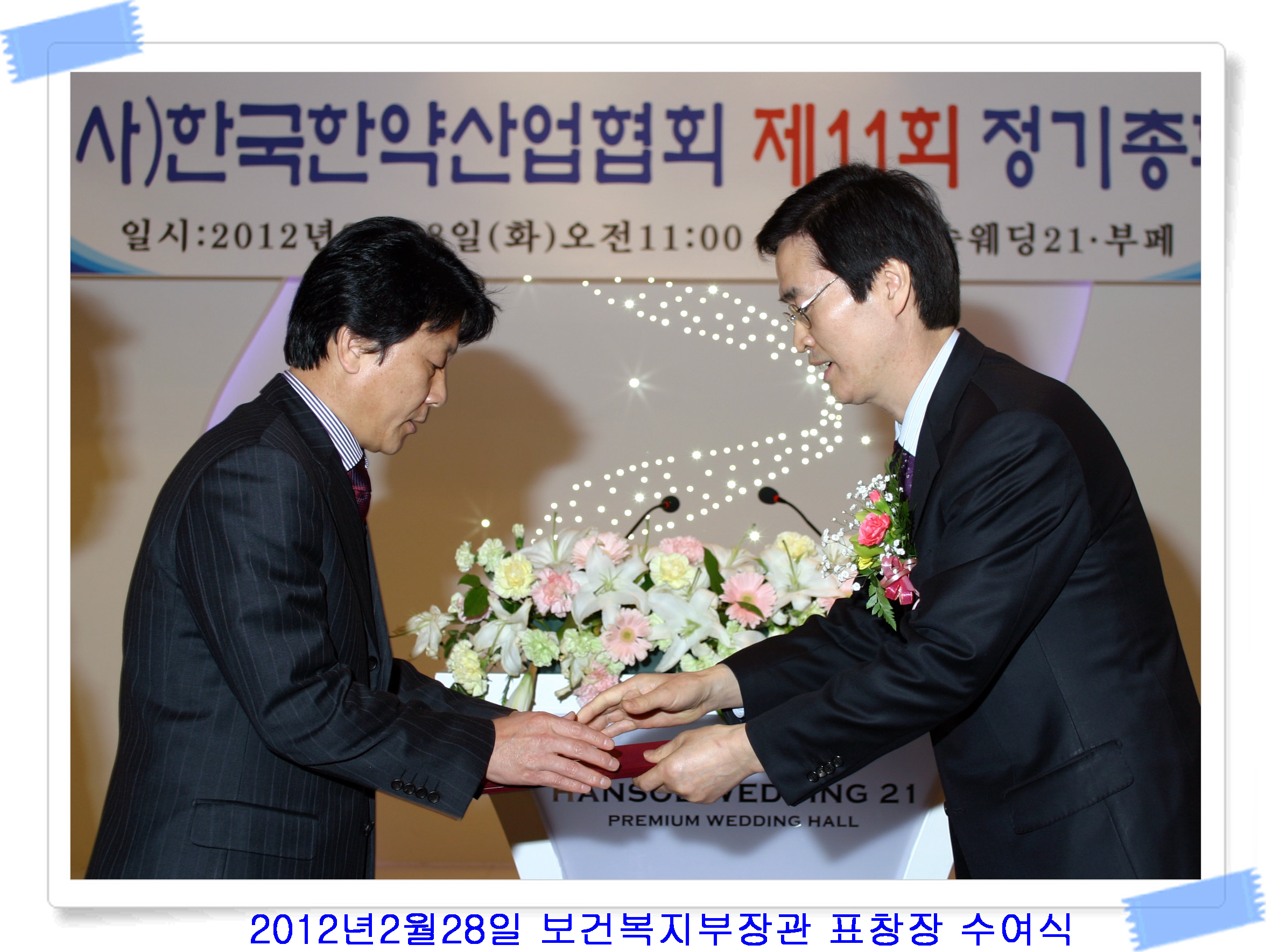 제 11차 한국한약산업협회 정기총회가 1012년 2월 28일 개최되었습니다. 이번 정기총회에 서는 그동안 한의학산업에 공로가 큰 업체를 선정하여 감사패 및 공로패를 수상 하였으며 저희 대영제약(주) 다우림이 보건복지부 장관상을 수상 받았습니다. 이번 표창장이 끝이 아닌 시작이라는 생각으로 앞으로 한약재의 완벽한 품질 관리와 유통질 서를 체계적으로 안착시켜 한방의료기관들이 편안한 진료환경에서 국민의 건강 증진만을 위 해 매진할 수 있도록 더욱 노력하겠습니다. ![]() 대 영 제 약(주)